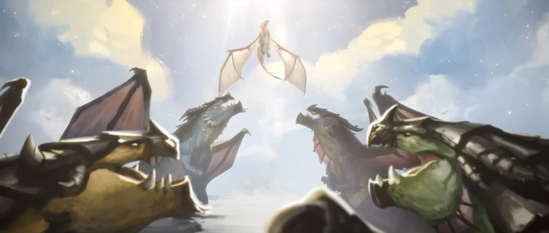 Die Drachenaspekte (auch Große Aspekte oder schlicht Aspekte) sind die Anführer der fünf Drachenschwärme und wurden in der offiziell erzählten Version von den Titanen aus einem Protodrachen namens Galakrond erschaffen.[1] Tatsächlich waren es die Wächter der Titanen, welche fünf auserwählten Drachen enorme Kräfte für ihre Verdienste im Kampf gegen selbigen Galakrond verliehen, um über das urzeitliche Kalimdor und seine Entwicklung zu wachen.[2] Einer Legende zufolge gab es bei der Erschaffung der ersten Aspekte eine seltene Verbindung zwischen Azeroths beiden Monden, welche für einige Mitglieder des Blauen Drachenschwarms später als ausschlaggebendes Kriterium zur Bestimmung eines neuen Aspekts theoretisiert wurde.[3]