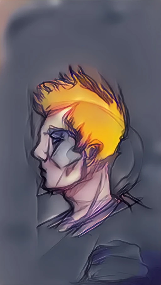 Aschblondes Haar fällt auf die Stirn des jungen Menschen und versteckt die Furchen, die sich auf der dunklen Haut immer öfter bilden. Die Wangenknochen heben sich markant ab und bilden mit dem spitzen Kinn ein Dreieck. Über die Nase zieht sich eine Kerbe, die den harten Konturen ihre Schärfe nicht nimmt. Die rechte Ohrmuschel fehlt zur Hälfte; es sieht aus als sei das Ohr kupiert worden. Der Blick lässt trotz seiner fatalistischen Kühle eine respektvolle Distanz vermissen.